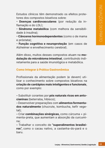 Loujaq - Alimentos | Gastronomia | Gest%u00e3o | Legisla%u00e7%u00e3o13Estudos cl%u00ednicos t%u00eam demonstrado os efeitos protetores dos compostos bioativos sobre:- Doen%u00e7as cardiovasculares (por redu%u00e7%u00e3o da inflama%u00e7%u00e3o e do LDL);- S%u00edndrome metab%u00f3lica (com melhora da sensibilidade %u00e0 insulina);- C%u00e2nceres hormonodependentes (como o de mama e pr%u00f3stata);- Fun%u00e7%u00e3o cognitiva e neuroprote%u00e7%u00e3o (em casos de Alzheimer e envelhecimento cerebral).Al%u00e9m disso, muitos desses compostos atuam na modula%u00e7%u00e3o do microbioma intestinal, contribuindo indiretamente para a sa%u00fade imunol%u00f3gica e metab%u00f3lica.Como Integrar %u00e0 Pr%u00e1tica Gastron%u00f4micaProfissionais da alimenta%u00e7%u00e3o podem (e devem) utilizar o conhecimento sobre compostos bioativos na cria%u00e7%u00e3o de card%u00e1pios mais inteligentes e funcionais, como por exemplo:- Substituir corantes por p%u00f3s naturais ricos em antocianinas (beterraba, hibisco);- Desenvolver prepara%u00e7%u00f5es com alimentos fermentados naturalmente (chucrute, kombucha, kefir vegetal);- Criar combina%u00e7%u00f5es sin%u00e9rgicas, como c%u00farcuma + pimenta-preta, que aumentam a absor%u00e7%u00e3o da curcumina;- Trabalhar o conceito de %u201csuperalimentos brasileiros%u201d, como o cacau nativo, a castanha-do-par%u00e1 e obaru.INOVA%u00c7%u00d5ES DO PRATO