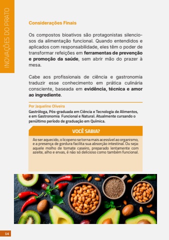 14Considera%u00e7%u00f5es FinaisOs compostos bioativos s%u00e3o protagonistas silenciosos da alimenta%u00e7%u00e3o funcional. Quando entendidos e aplicados com responsabilidade, eles t%u00eam o poder de transformar refei%u00e7%u00f5es em ferramentas de preven%u00e7%u00e3o e promo%u00e7%u00e3o da sa%u00fade, sem abrir m%u00e3o do prazer %u00e0 mesa.Cabe aos profissionais de ci%u00eancia e gastronomia traduzir esse conhecimento em pr%u00e1tica culin%u00e1riaconsciente, baseada em evid%u00eancia, t%u00e9cnica e amor ao ingrediente.VOC%u00ca SABIA?Ao ser aquecido, o licopeno se torna mais acess%u00edvel ao organismo, e a presen%u00e7a de gordura facilita sua absor%u00e7%u00e3o intestinal. Ou seja: aquele molho de tomate caseiro, preparado lentamente com azeite, alho e ervas, %u00e9 n%u00e3o s%u00f3 delicioso como tamb%u00e9m funcional.Gastr%u00f3loga, P%u00f3s-graduada em Ci%u00eancia e Tecnologia de Alimentos, e em Gastronomia Funcional e Natural. Atualmente cursando o pen%u00faltimo per%u00edodo de gradua%u00e7%u00e3o em Qu%u00edmica.Por Jaqueline OliveiraINOVA%u00c7%u00d5ES DO PRATO