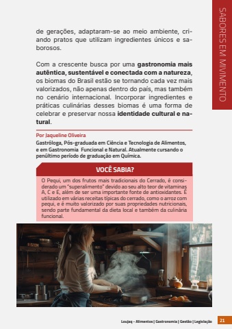 Loujaq - Alimentos | Gastronomia | Gest%u00e3o | Legisla%u00e7%u00e3o21de gera%u00e7%u00f5es, adaptaram-se ao meio ambiente, criando pratos que utilizam ingredientes %u00fanicos e saborosos.Com a crescente busca por uma gastronomia mais aut%u00eantica, sustent%u00e1vel e conectada com a natureza, os biomas do Brasil est%u00e3o se tornando cada vez mais valorizados, n%u00e3o apenas dentro do pa%u00eds, mas tamb%u00e9m no cen%u00e1rio internacional. Incorporar ingredientes e pr%u00e1ticas culin%u00e1rias desses biomas %u00e9 uma forma de celebrar e preservar nossa identidade cultural e natural.Gastr%u00f3loga, P%u00f3s-graduada em Ci%u00eancia e Tecnologia de Alimentos, e em Gastronomia Funcional e Natural. Atualmente cursando o pen%u00faltimo per%u00edodo de gradua%u00e7%u00e3o em Qu%u00edmica.Por Jaqueline OliveiraVOC%u00ca SABIA?O Pequi, um dos frutos mais tradicionais do Cerrado, %u00e9 considerado um %u201csuperalimento%u201d devido ao seu alto teor de vitaminas A, C e E, al%u00e9m de ser uma importante fonte de antioxidantes. %u00c9 utilizado em v%u00e1rias receitas t%u00edpicas do cerrado, como o arroz com pequi, e %u00e9 muito valorizado por suas propriedades nutricionais, sendo parte fundamental da dieta local e tamb%u00e9m da culin%u00e1ria funcional.SABORES EM MIVIMENTO