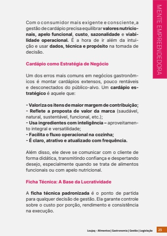 Loujaq - Alimentos | Gastronomia | Gest%u00e3o | Legisla%u00e7%u00e3o23Com o consumidor mais exigente e consciente,a gest%u00e3o de card%u00e1pio precisa equilibrar valores nutricionais,apelo funcional, custo, sazonalidade e viabilidade operacional. %u00c9 a hora de ir al%u00e9m da intui%u00e7%u00e3o e usar dados, t%u00e9cnica e prop%u00f3sito na tomada dedecis%u00e3o.Card%u00e1pio como Estrat%u00e9gia de Neg%u00f3cioUm dos erros mais comuns em neg%u00f3cios gastron%u00f4micos %u00e9 montar card%u00e1pios extensos, pouco rent%u00e1veis e desconectados do p%u00fablico-alvo. Um card%u00e1pio estrat%u00e9gico %u00e9 aquele que:- Valoriza os itens de maior margem de contribui%u00e7%u00e3o;- Reflete a proposta de valor da marca (saud%u00e1vel, natural, sustent%u00e1vel, funcional, etc.);- Usa ingredientes com intelig%u00eancia %u2013 aproveitamento integral e versatilidade;- Facilita o fluxo operacional na cozinha;- %u00c9 claro, atrativo e atualizado com frequ%u00eancia.Al%u00e9m disso, ele deve se comunicar com o cliente de forma did%u00e1tica, transmitindo confian%u00e7a e despertando desejo, especialmente quando se trata de alimentos funcionais ou com apelo nutricional.Ficha T%u00e9cnica: A Base da LucratividadeA ficha t%u00e9cnica padronizada %u00e9 o ponto de partida para qualquer decis%u00e3o de gest%u00e3o. Ela garante controlesobre o custo por por%u00e7%u00e3o, rendimento e consist%u00eancia na execu%u00e7%u00e3o.MENTE EMPREENDEDORA