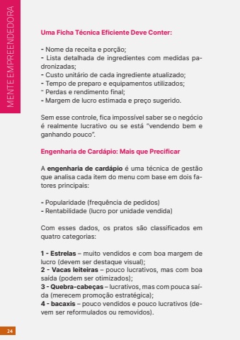 24Uma Ficha T%u00e9cnica Eficiente Deve Conter:- Nome da receita e por%u00e7%u00e3o;- Lista detalhada de ingredientes com medidas padronizadas;- Custo unit%u00e1rio de cada ingrediente atualizado;- Tempo de preparo e equipamentos utilizados;%u207b Perdas e rendimento final;- Margem de lucro estimada e pre%u00e7o sugerido.Sem esse controle, fica imposs%u00edvel saber se o neg%u00f3cio %u00e9 realmente lucrativo ou se est%u00e1 %u201cvendendo bem e ganhando pouco%u201d.Engenharia de Card%u00e1pio: Mais que PrecificarA engenharia de card%u00e1pio %u00e9 uma t%u00e9cnica de gest%u00e3o que analisa cada item do menu com base em dois fatores principais:- Popularidade (frequ%u00eancia de pedidos)- Rentabilidade (lucro por unidade vendida)Com esses dados, os pratos s%u00e3o classificados em quatro categorias:1 - Estrelas %u2013 muito vendidos e com boa margem de lucro (devem ser destaque visual);2 - Vacas leiteiras %u2013 pouco lucrativos, mas com boa sa%u00edda (podem ser otimizados);3 - Quebra-cabe%u00e7as %u2013 lucrativos, mas com pouca sa%u00edda (merecem promo%u00e7%u00e3o estrat%u00e9gica);4 - bacaxis %u2013 pouco vendidos e pouco lucrativos (devem ser reformulados ou removidos).MENTE EMPREENDEDORA