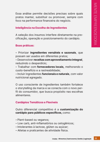 Loujaq - Alimentos | Gastronomia | Gest%u00e3o | Legisla%u00e7%u00e3o25Essa an%u00e1lise permite decis%u00f5es precisas sobre quais pratos manter, substituir ou promover, sempre com foco na performance financeira do neg%u00f3cio.Intelig%u00eancia na Escolha de IngredientesA sele%u00e7%u00e3o dos insumos interfere diretamente na precifica%u00e7%u00e3o, opera%u00e7%u00e3o e posicionamento do card%u00e1pio.Boas pr%u00e1ticas:- Priorizar ingredientes vers%u00e1teis e sazonais, que possam ser usados em diferentes pratos;- Desenvolver receitas com aproveitamento integral, reduzindo o desperd%u00edcio;- Trabalhar com fornecedores locais, melhorando o custo-benef%u00edcio e a rastreabilidade;- Incluir ingredientes funcionais e naturais, com valor nutricional agregado.O uso consciente de ingredientes tamb%u00e9m fortalece o storytelling da marca e se conecta com o novo perfil do consumidor, que busca prop%u00f3sito nas escolhasalimentares.Card%u00e1pios Tem%u00e1ticos e Flex%u00edveisOutro diferencial competitivo %u00e9 a customiza%u00e7%u00e3o do card%u00e1pio para p%u00fablicos espec%u00edficos, como:- Plant-based ou veganos;- Low carb, anti-inflamat%u00f3rios ou cetog%u00eanicos;- Intolerantes %u00e0 lactose, gl%u00faten ou a%u00e7%u00facar;- Atletas e praticantes de atividade f%u00edsica.MENTE EMPREENDEDORA