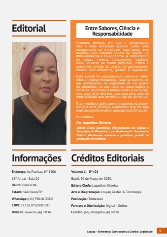 Loujaq - Alimentos | Gastronomia | Gest%u00e3o | Legisla%u00e7%u00e3o3EditorialVivemos tempos em que a alimenta%u00e7%u00e3o n%u00e3o %u00e9 mais encarada apenas como umanecessidade ou um prazer, mas como uma escolha com impacto direto na sa%u00fade, no meio ambiente e na economia. A cada edi%u00e7%u00e3o da nossa revista, buscaremos explorar esse universo de forma profunda, cr%u00edtica e acess%u00edvel, unindo os pilares da gastronomia, ci%u00eancia dos alimentos, gest%u00e3o e legisla%u00e7%u00e3o.Esta edi%u00e7%u00e3o foi pensada para provocar reflex%u00f5es e inspirar mudan%u00e7as , seja na cozinha de um restaurante, na prancheta de um gestor de alimentos, ou nas m%u00e3os de quem legisla e fiscaliza. Abordamos temas atuais e necess%u00e1rios, com olhar t%u00e9cnico, mas sem abrir m%u00e3o da sensibilidade que envolve o ato de alimentar.%u00c9 com muito orgulho que entregamos este conte%u00fado a voc%u00ea, leitor(a), esperando que ele seja mais do que informativo: que seja transformador. Boa leitura!Entre Sabores, Ci%u00eancia e ResponsabilidadeEditora Chefe. Gastr%u00f3loga, P%u00f3s-graduada em Ci%u00eancia e Tecnologia de Alimentos, e em Gastronomia Funcional e Natural. Atualmente cursando o pen%u00faltimo per%u00edodo de gradua%u00e7%u00e3o em Qu%u00edmica.Por Jaqueline OliveiraVolume: 1 | N%u00ba: 01Brasil, 30 de Mar%u00e7o de 2025.Editora Chefe: Jaqueline OliveiraArte e Diagrama%u00e7%u00e3o: Loujaq Gest%u00e3o & TecnologiaPublica%u00e7%u00e3o: TrimestralFormato e Distribui%u00e7%u00e3o: Digital - OnlineContato: [email protected]%u00e7o: Av. Paulista, N%u00ba 110616%u00ba Andar - Sala 01Bairro: Bela VistaEstado: S%u00e3o Paulo/SPWhatsApp: (11) 93618-3380CNPJ: 57.168.079/0001-81Website: www.loujaq.net.brInforma%u00e7%u00f5esCr%u00e9ditos Editoriais