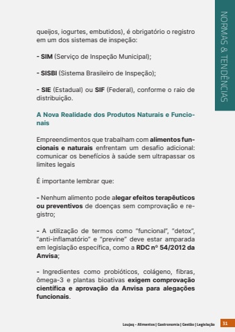 Loujaq - Alimentos | Gastronomia | Gest%u00e3o | Legisla%u00e7%u00e3o31queijos, iogurtes, embutidos), %u00e9 obrigat%u00f3rio o registro em um dos sistemas de inspe%u00e7%u00e3o:- SIM (Servi%u00e7o de Inspe%u00e7%u00e3o Municipal);- SISBI (Sistema Brasileiro de Inspe%u00e7%u00e3o);- SIE (Estadual) ou SIF (Federal), conforme o raio de distribui%u00e7%u00e3o.A Nova Realidade dos Produtos Naturais e FuncionaisEmpreendimentos que trabalham com alimentos funcionais e naturais enfrentam um desafio adicional: comunicar os benef%u00edcios %u00e0 sa%u00fade sem ultrapassar os limites legais%u00c9 importante lembrar que:- Nenhum alimento pode alegar efeitos terap%u00eauticos ou preventivos de doen%u00e7as sem comprova%u00e7%u00e3o e registro;- A utiliza%u00e7%u00e3o de termos como %u201cfuncional%u201d, %u201cdetox%u201d, %u201canti-inflamat%u00f3rio%u201d e %u201cprevine%u201d deve estar amparada em legisla%u00e7%u00e3o espec%u00edfica, como a RDC n%u00ba 54/2012 da Anvisa;- Ingredientes como probi%u00f3ticos, col%u00e1geno, fibras, %u00f4mega-3 e plantas bioativas exigem comprova%u00e7%u00e3o cient%u00edfica e aprova%u00e7%u00e3o da Anvisa para alega%u00e7%u00f5es funcionais.NORMAS & TEND%u00caNCIAS