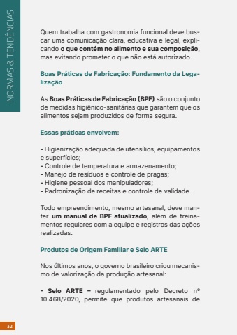 32Quem trabalha com gastronomia funcional deve buscar uma comunica%u00e7%u00e3o clara, educativa e legal, explicando o que cont%u00e9m no alimento e sua composi%u00e7%u00e3o, mas evitando prometer o que n%u00e3o est%u00e1 autorizado.Boas Pr%u00e1ticas de Fabrica%u00e7%u00e3o: Fundamento da Legaliza%u00e7%u00e3oAs Boas Pr%u00e1ticas de Fabrica%u00e7%u00e3o (BPF) s%u00e3o o conjunto de medidas higi%u00eanico-sanit%u00e1rias que garantem que os alimentos sejam produzidos de forma segura.Essas pr%u00e1ticas envolvem:- Higieniza%u00e7%u00e3o adequada de utens%u00edlios, equipamentos e superf%u00edcies;- Controle de temperatura e armazenamento;- Manejo de res%u00edduos e controle de pragas;- Higiene pessoal dos manipuladores;- Padroniza%u00e7%u00e3o de receitas e controle de validade.Todo empreendimento, mesmo artesanal, deve manter um manual de BPF atualizado, al%u00e9m de treinamentos regulares com a equipe e registros das a%u00e7%u00f5es realizadas.Produtos de Origem Familiar e Selo ARTENos %u00faltimos anos, o governo brasileiro criou mecanismo de valoriza%u00e7%u00e3o da produ%u00e7%u00e3o artesanal:- Selo ARTE %u2013 regulamentado pelo Decreto n%u00ba 10.468/2020, permite que produtos artesanais de NORMAS & TEND%u00caNCIAS