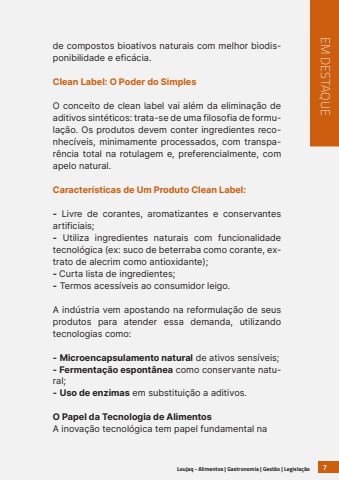 Loujaq - Alimentos | Gastronomia | Gest%u00e3o | Legisla%u00e7%u00e3o7de compostos bioativos naturais com melhor biodisponibilidade e efic%u00e1cia.Clean Label: O Poder do SimplesO conceito de clean label vai al%u00e9m da elimina%u00e7%u00e3o de aditivos sint%u00e9ticos: trata-se de uma filosofia de formula%u00e7%u00e3o. Os produtos devem conter ingredientes reconhec%u00edveis, minimamente processados, com transpar%u00eancia total na rotulagem e, preferencialmente, com apelo natural.Caracter%u00edsticas de Um Produto Clean Label:- Livre de corantes, aromatizantes e conservantesartificiais;- Utiliza ingredientes naturais com funcionalidade tecnol%u00f3gica (ex: suco de beterraba como corante, extrato de alecrim como antioxidante);- Curta lista de ingredientes;- Termos acess%u00edveis ao consumidor leigo.A ind%u00fastria vem apostando na reformula%u00e7%u00e3o de seus produtos para atender essa demanda, utilizandotecnologias como:-Microencapsulamento natural de ativos sens%u00edveis;-Fermenta%u00e7%u00e3o espont%u00e2nea como conservante natural;-Uso de enzimas em substitui%u00e7%u00e3o a aditivos.O Papel da Tecnologia de AlimentosA inova%u00e7%u00e3o tecnol%u00f3gica tem papel fundamental na EM DESTAQUE